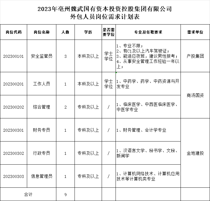 1、本次招聘崗位系2023年亳州魏武國有資本投資控股集團(tuán)有限公司外包崗位人員,錄用后與亳州市譙騰人力資源管理有限公司簽訂勞動(dòng)合同。辦理手續(xù)后安排到相應(yīng)的崗位工作地點(diǎn)。
