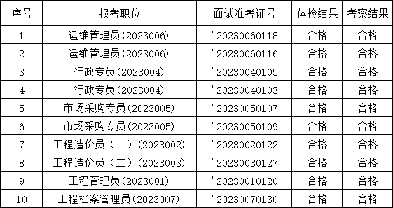 根據(jù)《亳州魏武國有資本投資控股集團(tuán)有限公司2023年工作人員公開招聘》相關(guān)規(guī)定,現(xiàn)將擬入圍對象體檢、考察結(jié)果公示如下: