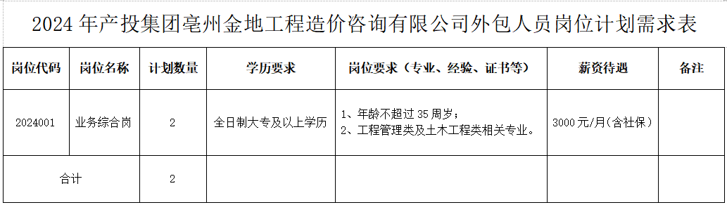 1、本次招聘崗位系產(chǎn)投集團亳州金地工程造價咨詢有限公司外包人員,錄用后與亳州市譙騰人力資源管理有限公司簽訂勞動合同。辦理手續(xù)后安排到相應(yīng)的崗位工作地點。