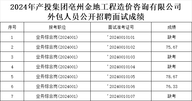 根據(jù)《2024年產(chǎn)投集團亳州金地工程造價咨詢有限公司外包人員公開招聘》有關規(guī)定,現(xiàn)將面試成績予以公示。