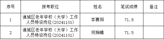 根據(jù)《2024年譙城區(qū)老年學校(大學)工作人員特設崗位公開招聘》精神,經面試、體檢、考察、選崗等環(huán)節(jié),確定李賽陽、何婉晴2名同志符合本次招聘條件,擬錄用為2024年譙城區(qū)老年學校(大學)工作人員,現(xiàn)予公示。