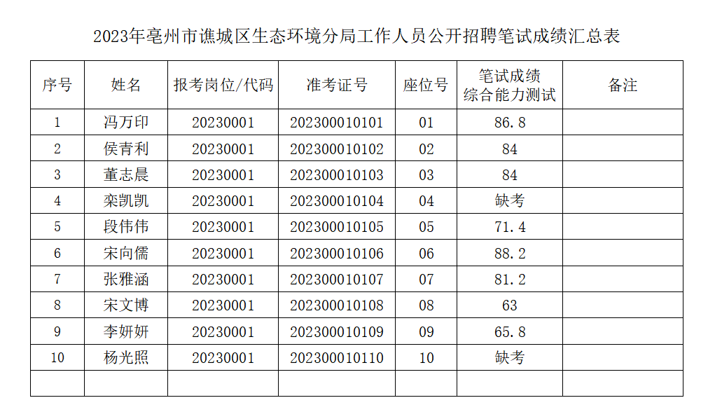 2023年亳州市譙城區(qū)生態(tài)環(huán)境分局 工作人員公開招聘筆試成績公示