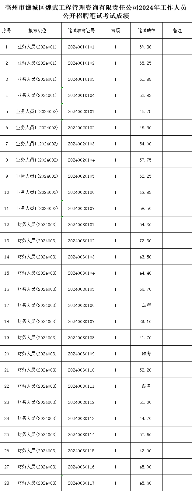 關(guān)于亳州市譙城區(qū)魏武工程管理咨詢有限責任公司2024年工作人員公開招聘筆試考試成績公示