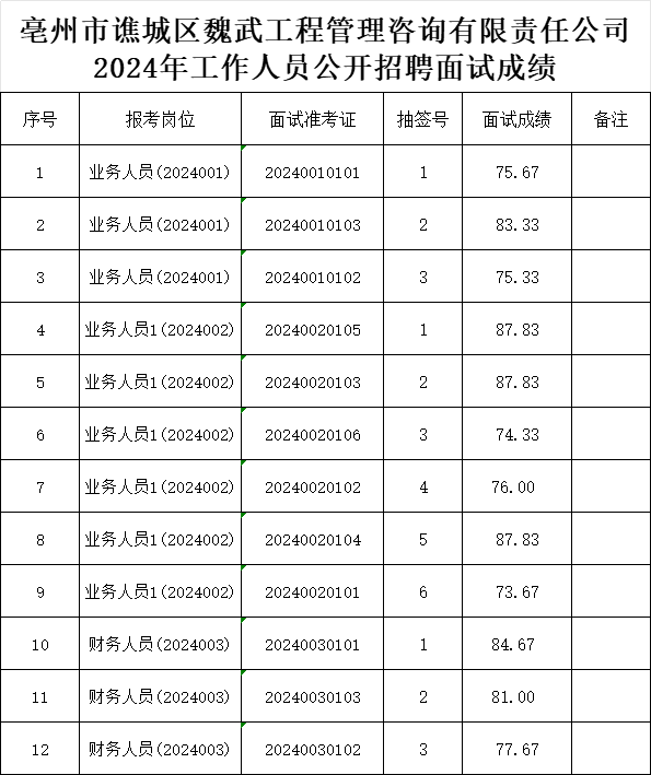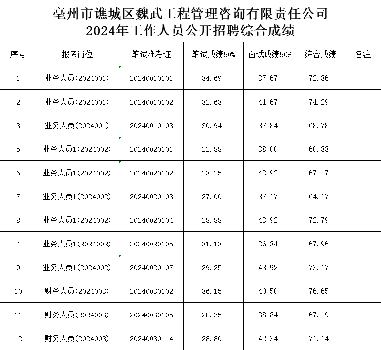 關(guān)于亳州市譙城區(qū)魏武工程管理咨詢有限責(zé)任公司2024年工作人員公開招聘面試成績及綜合成績的公示